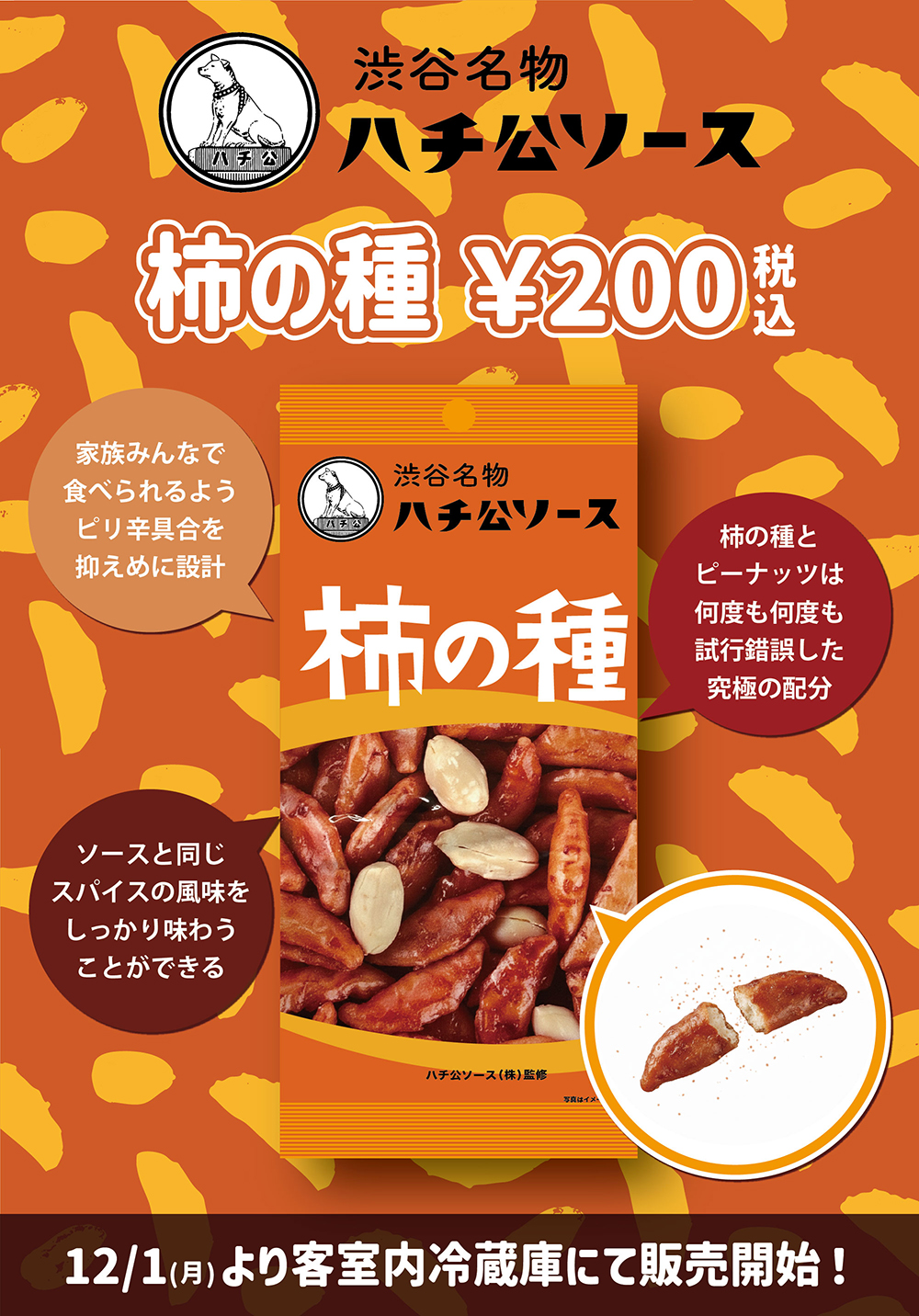 12月1日より、HOTEL555グループ全13店舗にて、渋谷名物「ハチ公ソース」と老舗米菓メーカーが手がけた【ハチ公ソース柿の種】を販売いたします。