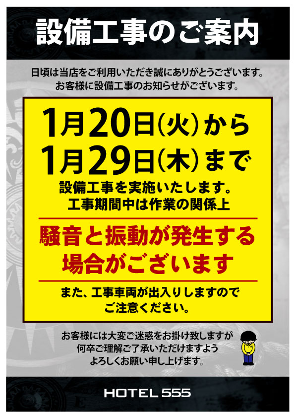 1月20日(火)~29日(木)HOTEL555 沼津駅北 設備工事のご案内