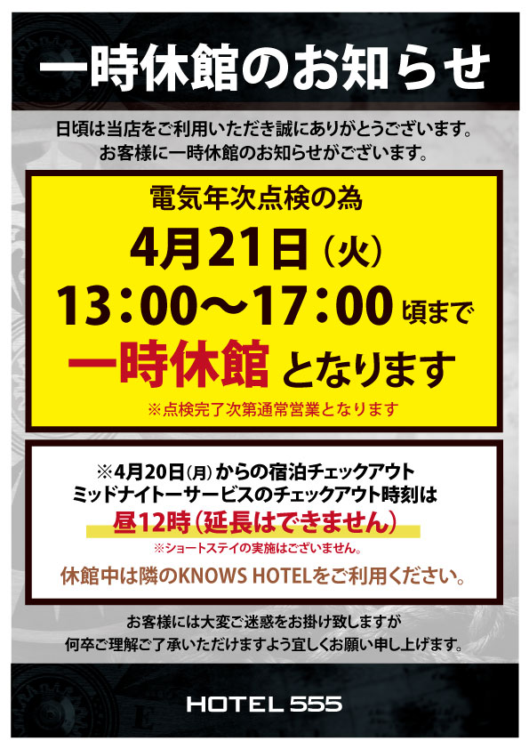 4月21日(火)HOTEL555 沼津駅北一時休館のご案内