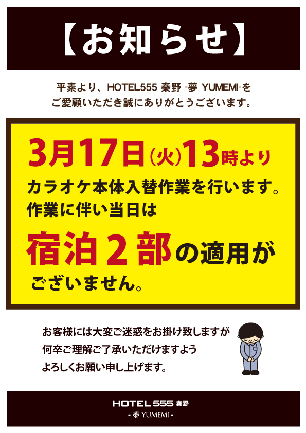 3月17日(火)HOTEL555 秦野 -夢 YUMEMI- カラオケ入替のお知らせ