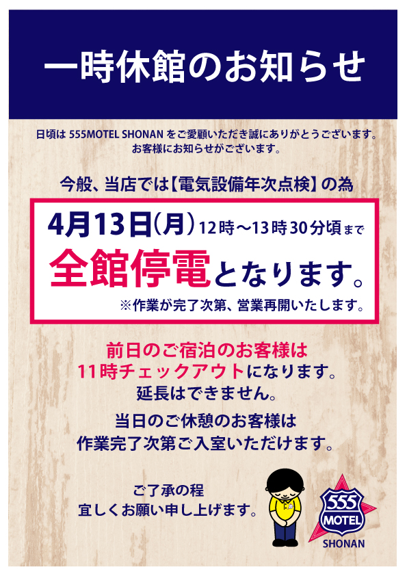 4月13日(月)555MOTEL-SHONAN-電気年次点検のお知らせ