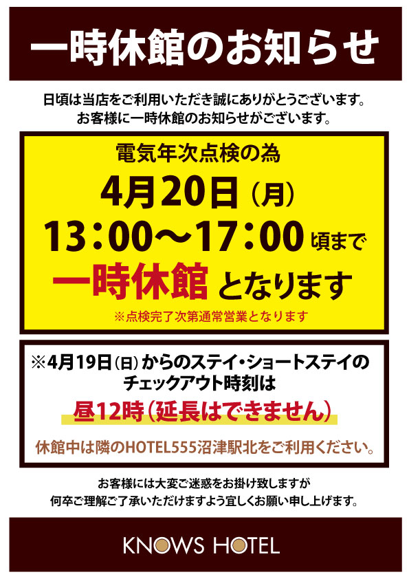 4月21日(火)HOTEL555 沼津駅北一時休館のご案内