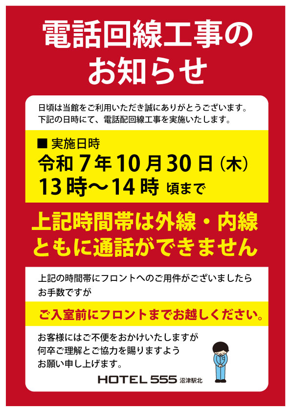 10月30日(木)HOTEL555錦糸町【電話回線工事】のお知らせ