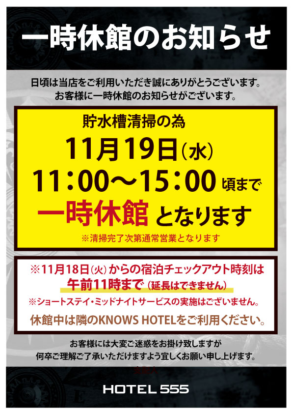 11月19日(水)HOTEL555 沼津駅北 一時休館のご案内