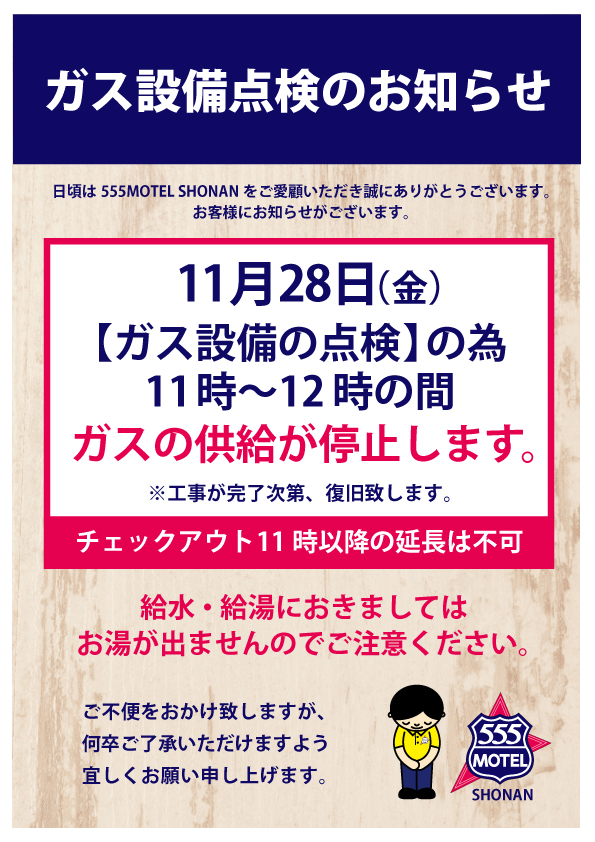 11月28日(金)555MOTEL-SHONAN-ガス設備点検のお知らせ