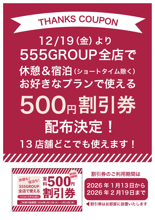 555GROUP全店でご利用いただける500円割引券を配布いたします。